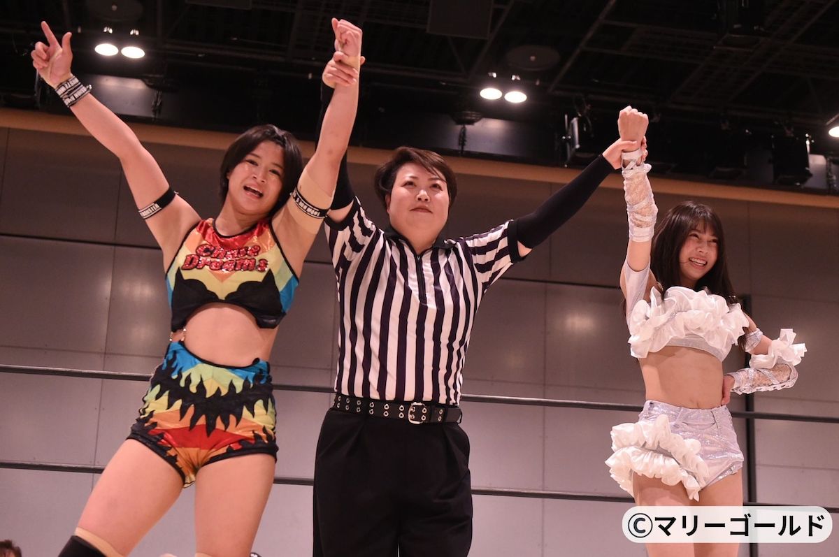 試合は心希がドロップキックを放てば橘もドロップキックで応戦。咲村も後輩の心希をヘッドシザースで攻め立て、試合は一進一退の攻防に。最後は山岡が水車落としを決めて橘から3カウントを奪取した。