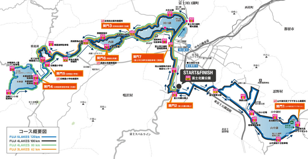 ウルトラマラソン初挑戦者からベテランランナーまで、自身の限界に挑むための4つのコース設定が特徴。富士五湖すべてを巡る最長距離のFUJI 5LAKES 120km、本栖湖を除くFUJI 4LAKES 100km、山中湖を除くFUJI 4LAKES 80km、そして3つの湖を巡るFUJI 3LAKES 62kmというコースだ。