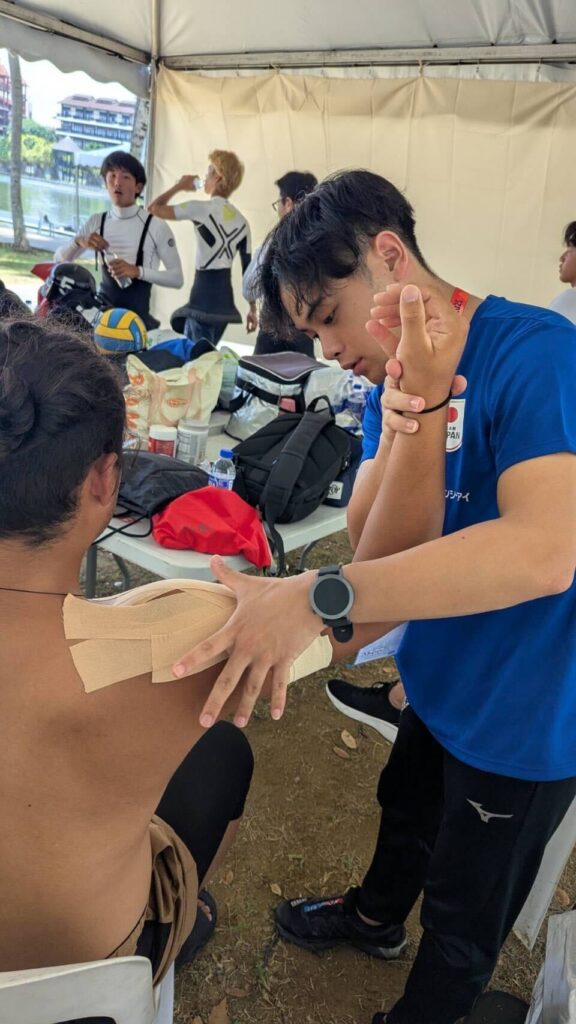 理学ボディのスタッフは練習や試合が終わるたびに休むことなく選手たちのケアを継続。カヌーポロという競技特有の体の使い方を理解し、一人ひとりの疲労や痛みに合わせた施術を提供した。