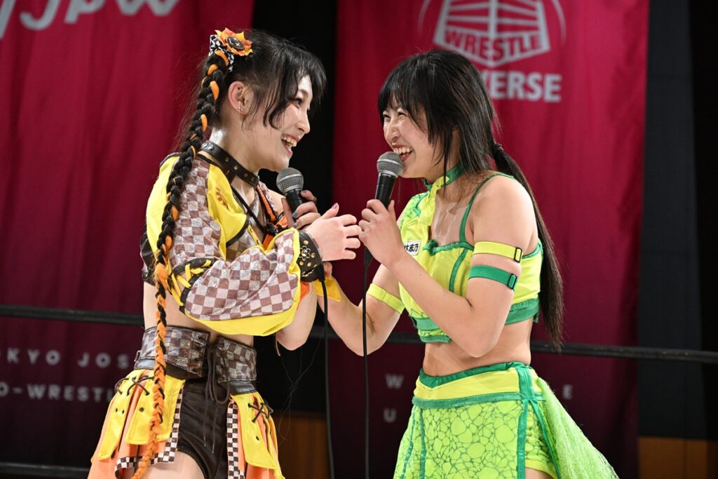 バックステージでも鈴木が「HIMAWARIさん帰ってきて、一緒に戦えて勝つことができたので。これはベルト、絶対獲れると思った。この勢いは後楽園ホールまで絶やさず、もっと勢い加速して頑張りたいと思います」と言うなど舌も滑らか。チーム名はHIMAWARIによると“正面衝突する輝く小石たち”との意で、「私たちは小石から正面衝突して輝いてみせます!」と目を輝かせた。王者組について、HIMAWARIは「相手にされてる?悔しいです。アイツらって感じだったので。あともう一戦(前哨戦が)できるのかな?できるんだったら、オーバーイーツに私たちを意識させられるように頑張りたい」と力を込めた。