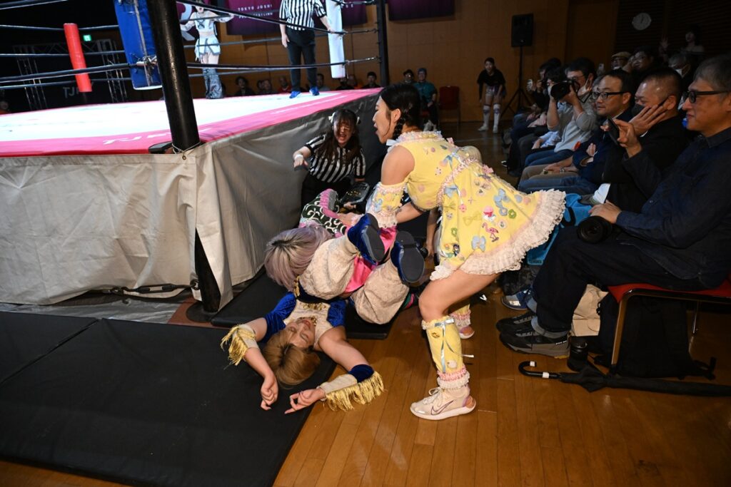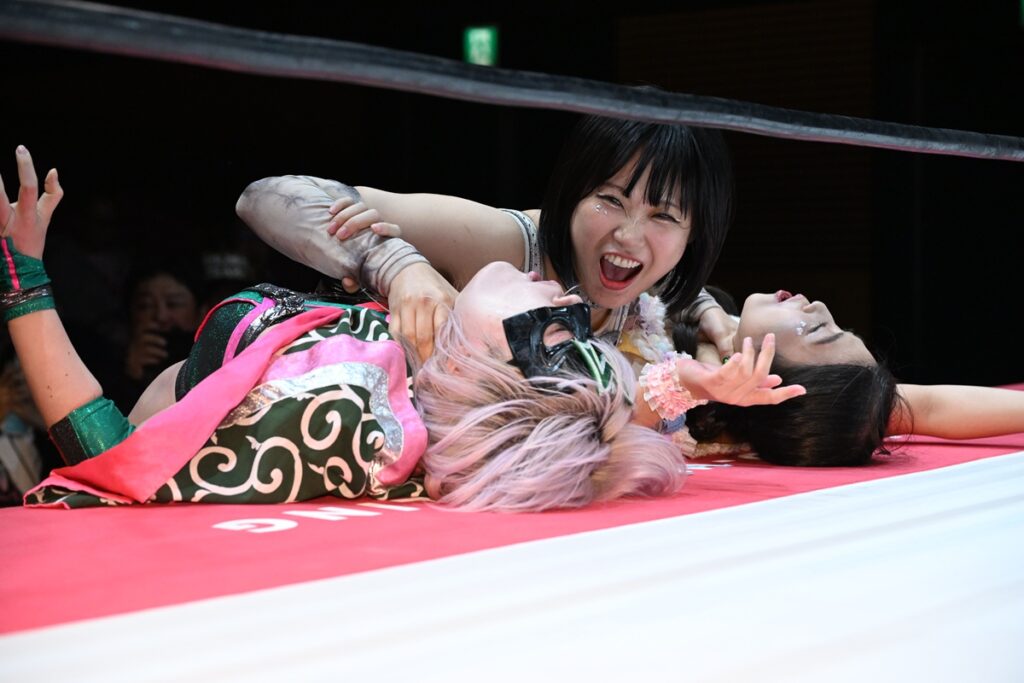 ミサヲ組の奇襲から始まった試合は、ミサヲがスプレー噴射から丸め込み連発も、桐生は必死で返していった。場外でもミサヲ、らくが丸め込みを図るも、辰巳が2人にチョーク攻撃。ところが辰巳が桐生の頭に一撃。リングに戻ると、辰巳はチョークからスライディングヒップを叩き込んで3カウントを奪い、ベルトが移動。それでも試合は続き、らくがハリケーンターンで丸め込んで勝利したが、ベルトはすでに辰巳の手に渡っており、らくにはむろん移動せず。