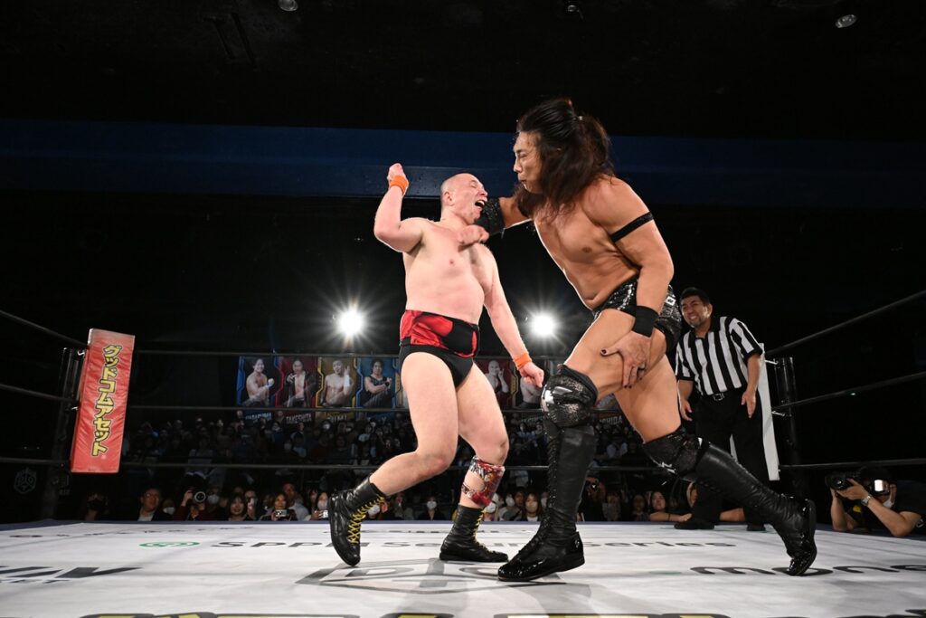 ナックルの打ち合いから、TAKESHITAは生エルボーでトドメを刺そうとするも、ここでもまたとどまった。最後は本多の得意技バイオニックエルボーから、レイジングファイヤーで3カウントを奪取した。