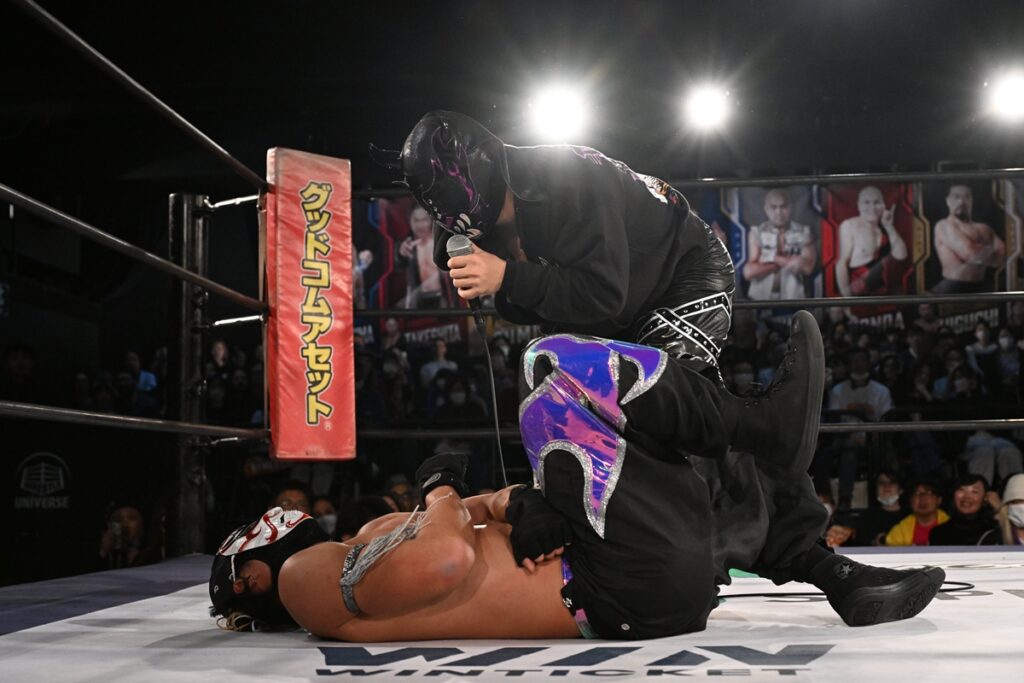 また、第2試合(吉村直巳&隈取vs高尾蒼馬&葛西陽向)が終わり、退場しようとしていた隈取をイルシオンが襲撃。リングに上がって、隈取がエルボーで反撃を試みるも、イルシオンの急所打ちで悶絶。