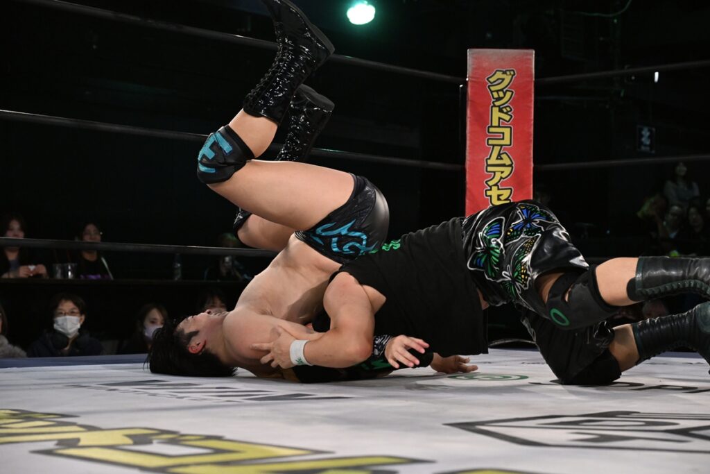 突如始まった非公式試合は押さえ込みの応酬から、丸め込み合戦へ。ウラノの逆さ押さえ込みはカウント2で返されるも、今度は変型逆さ押さえ込みでTo-yから3カウントを奪ってしまった。彰人は「アイアンマンじゃないんだから。