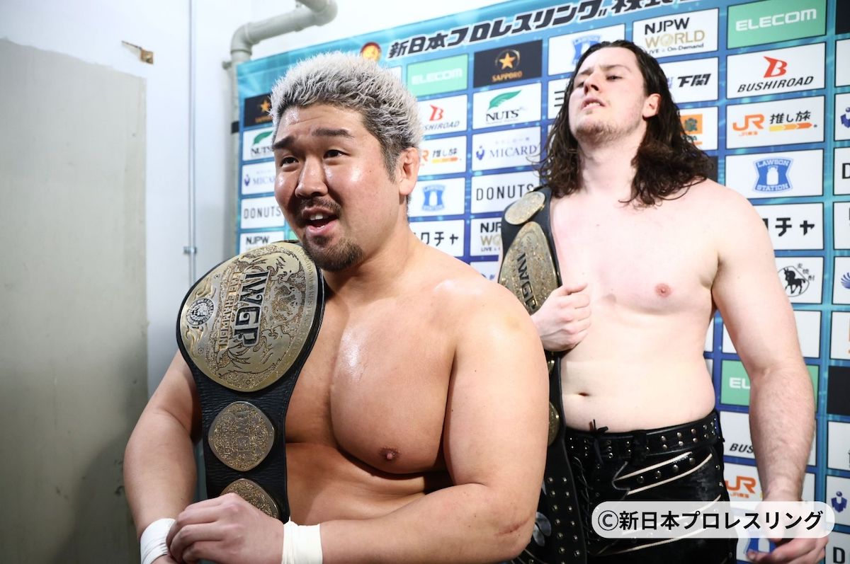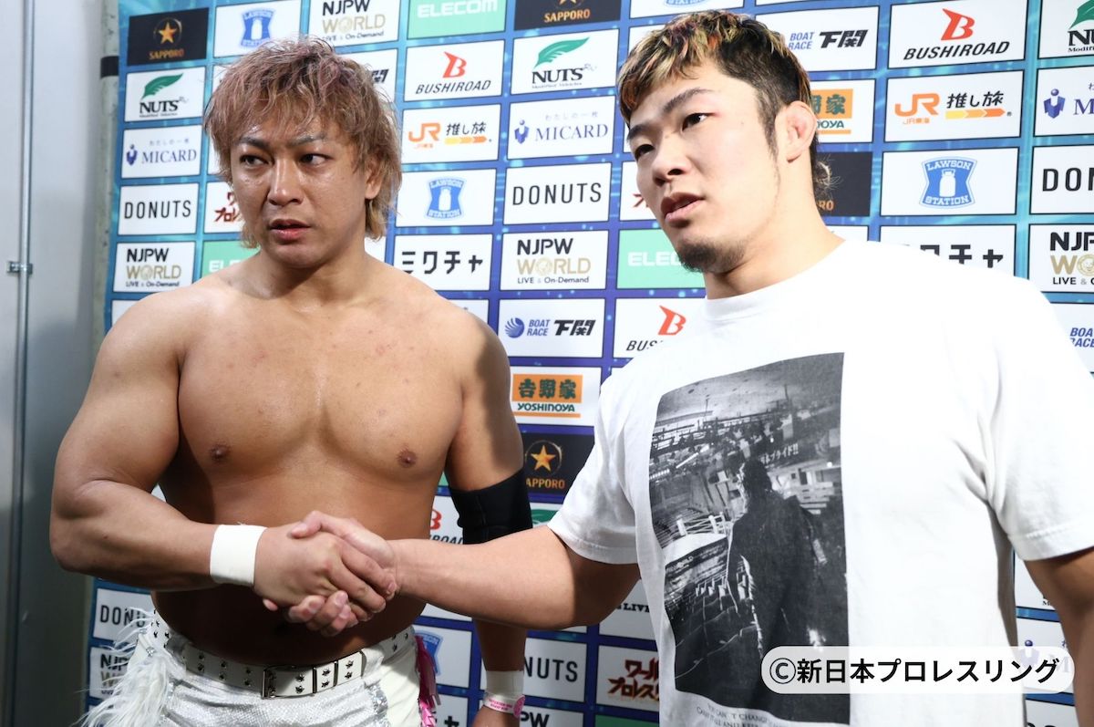 上村「よし(※と、握手に応える)。いいね。いやもう、何か、こうやってホントに熱くなってる姿見ると、僕があのIWGPタッグのベルトが欲しいっていうのはもちろん、この海野さんにも、俺はあのベルトを巻いてほしい。大阪まで時間はないけど、必ずあそこで俺たち勝ちましょう(※と、手を差し出す)」