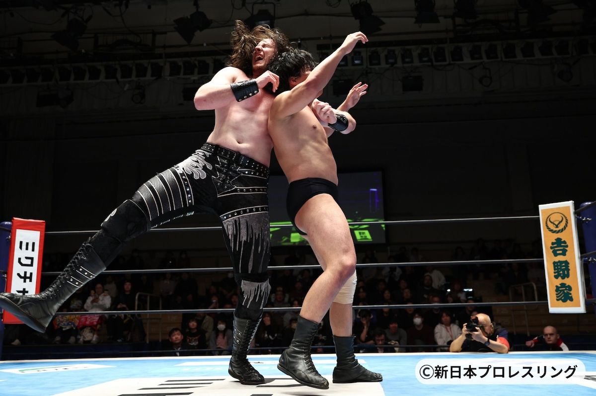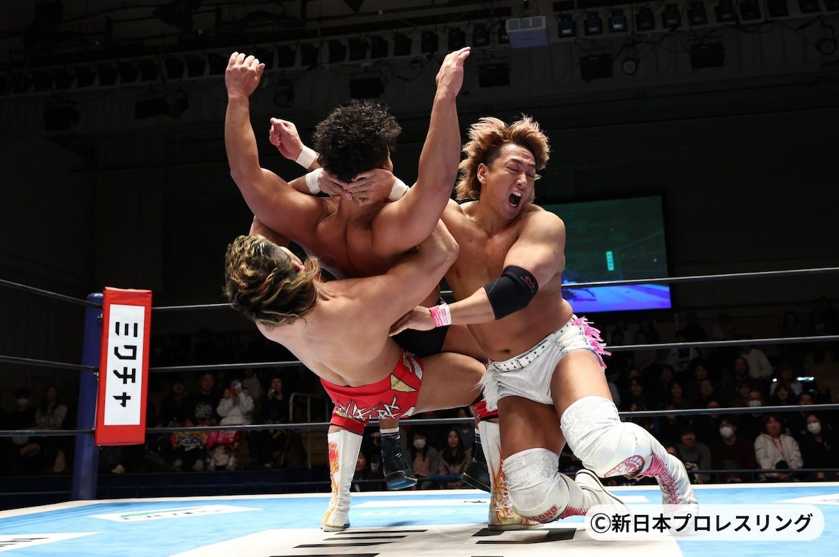 2日、新日本プロレス・後楽園ホール大会で、IWGPタッグ王者・Yuto-Ice&OSKAR(K.O.B)&永井大貴 vs 海野翔太&上村優也&安田優虎が6人タッグで激突。2.11大阪大会で、IWGPタッグ王座戦を控える王者K.O.Bと挑戦者の海野&上村が激しい前哨戦を繰り広げた。