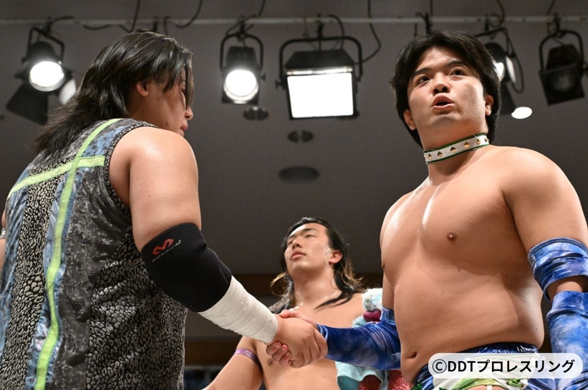 現在、同王座を保持するのはTHE RAMPAGEの武知海青、そして上野勇希&To-yの3人だ。バックステージで正田は「リーダーである正田壮史です。 この3人なら王座への挑戦権もある」と豪語し、高鹿も「DGS世代でDDTの底上げをする。3人で組んだ証しとしてベルトを獲りに行く」とタイトル奪取に強い意欲を示した。