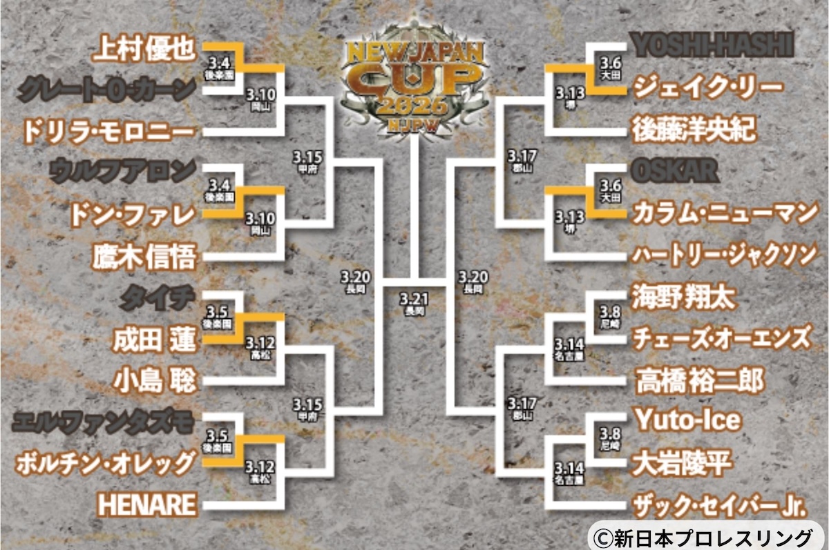 プロレス 【新日本NJC】レフェリー不在で幻のギブアップ!OSKAR無念の敗退、カラムが2回戦進出へ 2026年3月7日 NJC、OSKARは UNITED EMPIREの介入でカラムに敗れ1回戦敗退 NEW JAPAN CUP 2026トーナメント表(3月6日東京・大田区終了時点) 3月6日大田区を終えたNEW JAPAN CUP 2026トーナメント表 【インタビュー】新日本 永田裕志が語る”青義”のルーツと棚橋弘至との激闘(25年9月 アーカイブ) Tags: NEW JAPAN CUP OSKAR カラム・ニューマン 新日本プロレス Post navigation Previous: 【全日本】安齊勇馬――三冠“挑戦”の軌跡〜時代を背負う怪物たちと刻んだ血痕の記録〜Next: 元ホストから全日本プロレスのリングへ「6歳の頃に夢見た景色を、今度は僕が作りたい」――北斗軍加入で激変した愛澤No.1の現在地 ページ: 1 2 関連記事 プロレス 【全日本】安齊勇馬――三冠“挑戦”の軌跡〜時代を背負う怪物たちと刻んだ血痕の記録〜 2026年3月6日 プロレス 【全日本】第72代三冠ヘビー級王者・安齊勇馬 防衛の記録〜24歳10か月の衝撃。あの日、全日本の時計の針は安齊勇馬によって進められた〜 2026年3月6日 プロレス 【新日本NJC】タイチが悪夢の敗退!成田蓮がH.O.Tの無法介入で場内ブーイングも初戦強奪 2026年3月6日 プロレス 【新日本NJC】ボルチン「最強のレスラーになるために、ここにいる」――強敵ファンタズモを粉砕し2回戦へ 2026年3月5日 トレンド 元ホストから全日本プロレスのリングへ「6歳の頃に夢見た景色を、今度は僕が作りたい」――北斗軍加入で激変した愛澤No.1の現在地 1 元ホストから全日本プロレスのリングへ「6歳の頃に夢見た景色を、今度は僕が作りたい」――北斗軍加入で激変した愛澤No.1の現在地 2026年3月7日 【新日本NJC】レフェリー不在で幻のギブアップ!OSKAR無念の敗退、カラムが2回戦進出へ 2 【新日本NJC】レフェリー不在で幻のギブアップ!OSKAR無念の敗退、カラムが2回戦進出へ 2026年3月7日 【全日本】安齊勇馬――三冠“挑戦”の軌跡〜時代を背負う怪物たちと刻んだ血痕の記録〜 3 【全日本】安齊勇馬――三冠“挑戦”の軌跡〜時代を背負う怪物たちと刻んだ血痕の記録〜 2026年3月6日 【全日本】第72代三冠ヘビー級王者・安齊勇馬 防衛の記録〜24歳10か月の衝撃。あの日、全日本の時計の針は安齊勇馬によって進められた〜 4 【全日本】第72代三冠ヘビー級王者・安齊勇馬 防衛の記録〜24歳10か月の衝撃。あの日、全日本の時計の針は安齊勇馬によって進められた〜 2026年3月6日