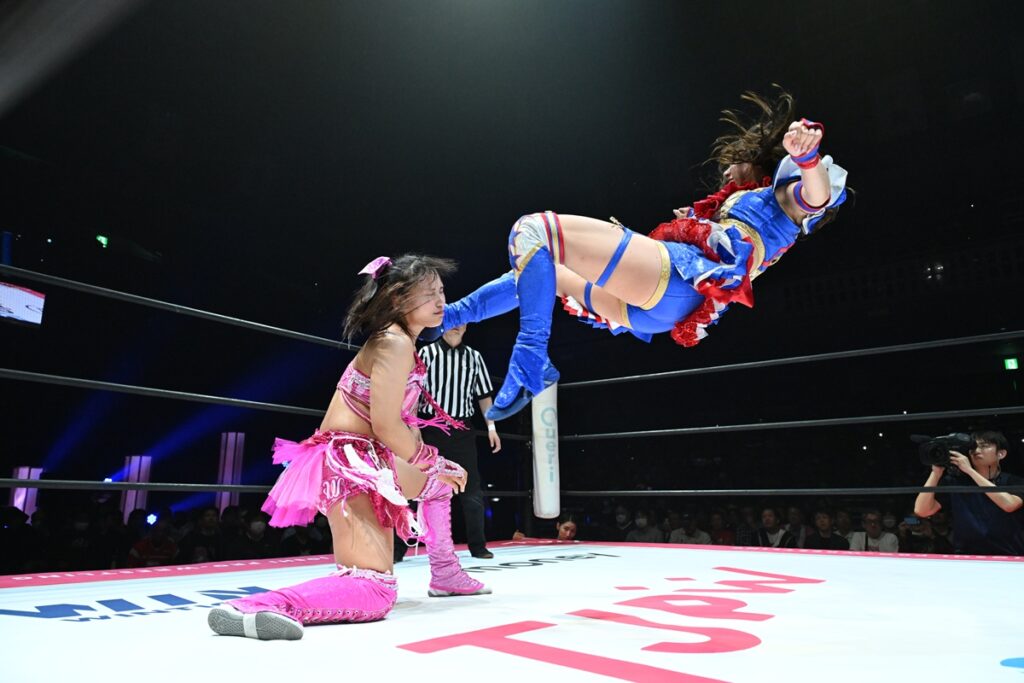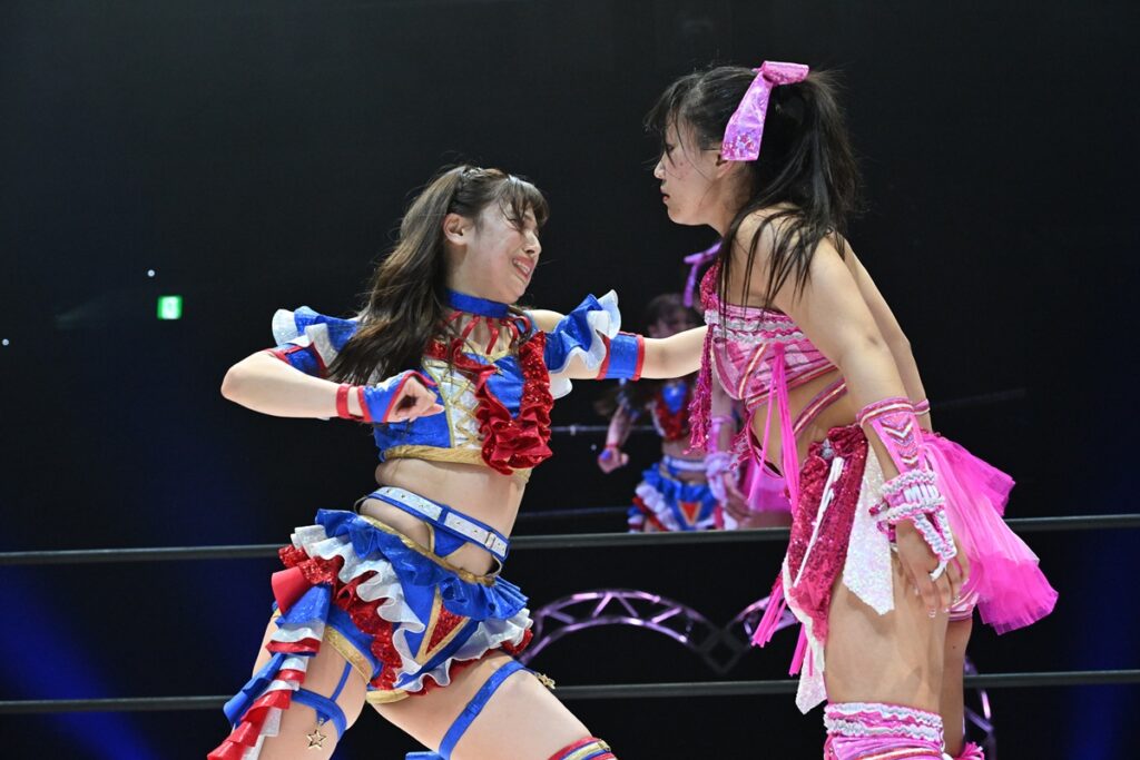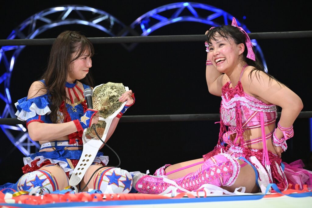 一方、王座から陥落した渡辺は「荒井優希との初のシングルマッチ、プリンセス・オブ・プリンセスの試合ができて、この両国で初シングルができて楽しかったです。悔しいんですけど、荒井はやっぱりすごいなって思う反面、荒井好きだなって思う反面、嫌いじゃないし好きなのに嫌いになっちゃったらイヤだって不安になります。何ですかね、この感情は。ここから荒井優希とまだまだ一生高め合いができると、荒井優希がリング上で言ってくれたので。最初の頃は荒井がいつまでいるか分からない状態で、デビュー戦、隣から始まったなか…一生やり合えるって、ここまで来てこうやってやり合えるって本当に幸せなことだなって思います。だから、ライバル、シングル1戦目は私が敗れたけど、次はもっと強くなって。もっともっと、這いつくばってでも強くなってみせます。ここからもっと強くなっていきます」と悔し涙を流しながらも、巻き返しを誓った。