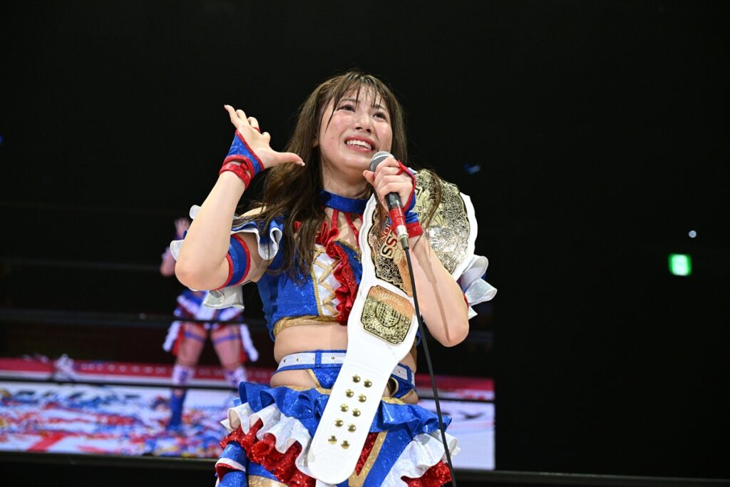 最後に荒井は「私、チャンピオンになったら、どんなチャンピオンになりたいかなってたくさん考えたんですよ。見つけました。荒井は夢を見るチャンピオンになりたいです。そして、大好きな仲間に夢を語りたいし、みんなで夢を叶えたいし、東京女子を愛してくれる皆さんに夢を見せたいです。私の夢があって、それは東京女子プロレスがもっともっとたくさんの方に愛してもらって、選手みんなで東京ドームで興行することです!凄くこれを言うのは勇気がいるけど、みんなの前で言ったので、一番バカみたいに私が夢を見て、みんなに信じられないような景色を見せたいと思うので、これからも東京女子プロレスをよろしくお願いします!」とマイクで締めくくった。