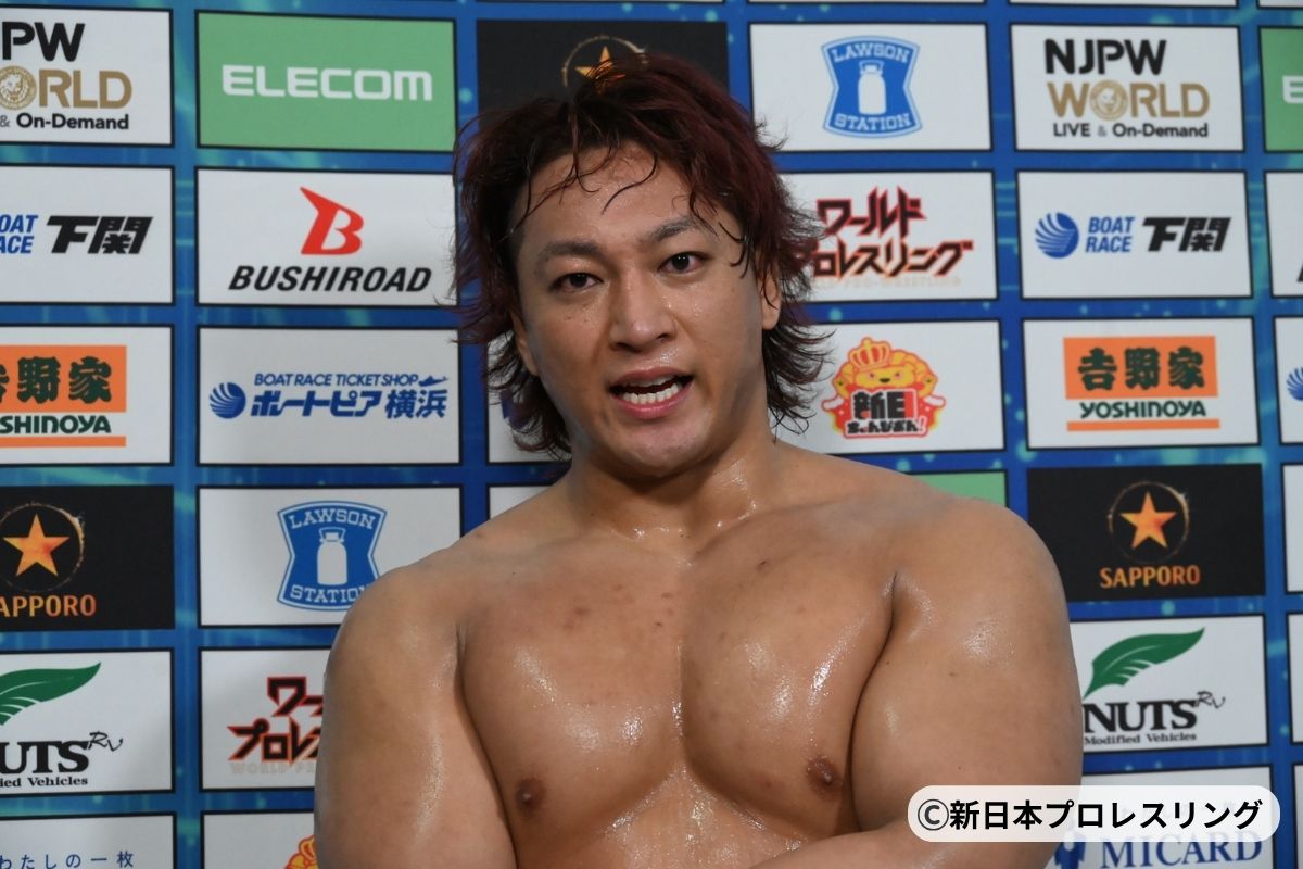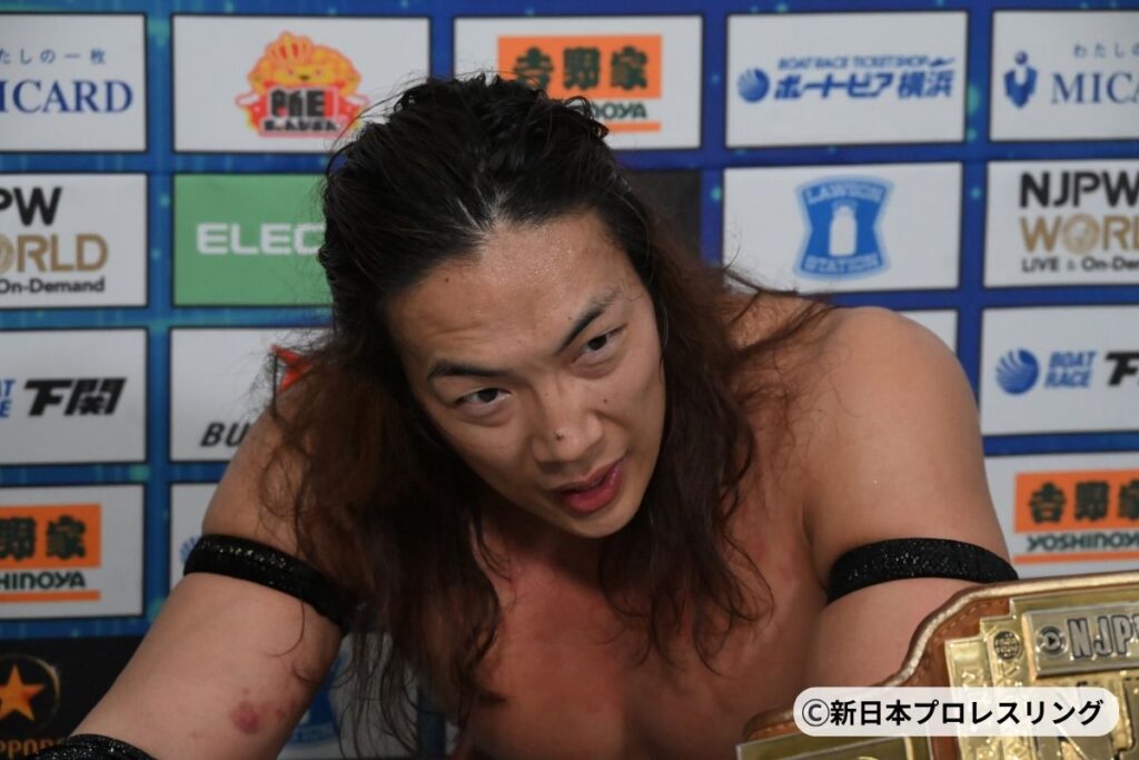 TAKESHITA「今日も勝たれへんかった。海野翔太に勝つビジョンしかないけど、この間負けて、今日は引き分けで、なんかしぶといんすよね、アイツ。なんかしぶとくて、これで立ってこないだろうっていうところから立ってくる。それが、海野翔太が持ってるものなのか、新日本魂がそうさせるのか、それは俺にはわからへんけど、なんかしぶといんよ、アイツ。そして、チェーズ・オーエンズ、そしてなんかあの“おかめ納豆”みたいな、なんかわけのわからんのが出てきたな。この俺に、世界のTAKESHITAに喧嘩売ってんのか? チェーズ、お前はこの間の長岡で裕二郎とほぼ2対1で闘って、ボコボコにしたやろう。まだ懲りてへんのか? いつでも1対1、やりたいならやったるぞ。あの“おかめ納豆”みたいなヤツも連れて来い。2人まとめてボコボコにしたるわ。海野翔太、またすぐやろうとは言えへん。俺、お前に勝てるようにもっと強くなっときますわ。From THE ALPHA」