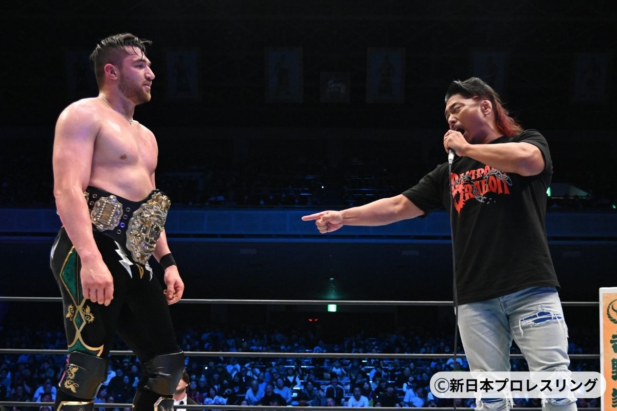 鷹木「バカヤロー。黙って帰るヤツがいるか! カラム、カラム、オマエやりやがったな。だが最後、なんだあのマネは? あれがオマエのやり方か? これがEMPIREのやり方か? きのうきょう海外から来て、そんな若造がIWGP取ったら、オレが黙ってるわけないだろ、オイ! カラム、ネクスト、アイ・チャレンジ・ユー。次はオレが相手だ。去年までは、ベルトもない、ユニットもないオレだったが、今は、Unbound Co.という仲間たちがいる。そして、守るべき家族ができた!次は、IWGPをいただくぞ!」